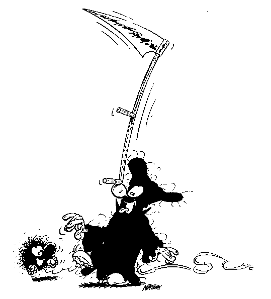1990 kreierte Natke den Kleinen Tod. Wahrscheinlich in Anlehnung an seine Serie "Die Mönche", die in ganz ähnlichen Kutten ihr Unwesen trieben.Es ging dabei um einen Sensenmann, dem es partout nicht gelingen will, seine "Kunden" ins Jenseits zu befördern. Es entstanden zunächst nur 10 halbseitige Gags (acht davon sind auch im Album zu finden). Erst Ende 1992 nahm Natke die Idee wieder auf und zeichnete bis Anfang 1994 die Gags 11-106 in unterschiedlichen Formaten. Da Natke sich von seinem bisherigen Verleger getrennt hatte, dauerte es bis 1995, bis er mit der Edition B&K einen neuen Partner fand. So erschien der erste Band "... todernst" 1996. Er enthält die Gags 3-83,85 und 86. Die erste Seite mit den Gags 1 und 2 hat der Zeichner nie "rausgerückt", der Gag 84 diente als erste Seite für das zweite Album. Die Gag 82 und 83 wurden die neuen Eröffnungsseiten. Das Album endet mit einem kleinen Disput über die Konsequenzen, sollte der Kleine Tod sich dem Zeichner zuwenden (unten auf dieser Seite). Doch auch mit diesem Verlag hatte Natke kein Glück. Schon zwei, drei Jahre später gab es die Edition B&K nicht mehr. Als sich im Jahr 2000 der zuständige Vertrieb "Medienservice" in Wuppertal mit der Frage nach "Nachschub" an Natke wandte, kam es zu einer Neuauflage im Unser Verlag. Nur die Titelseite wurde dabei leicht verändert (unten auf dieser Seite) und auf der Seite 26 wurde eine kleine Zeichnung ergänzt, die übersehen worden war. |