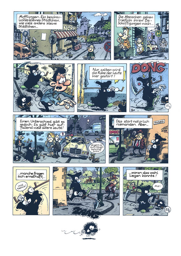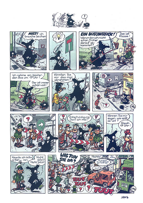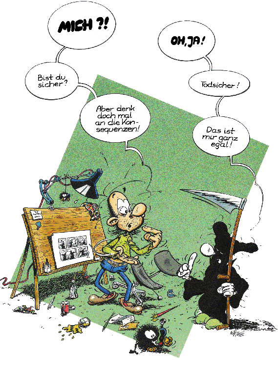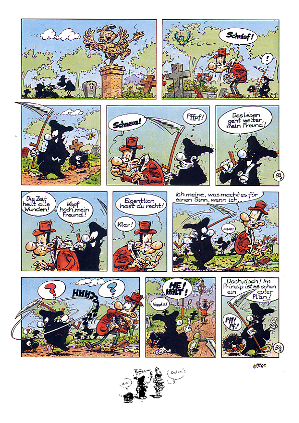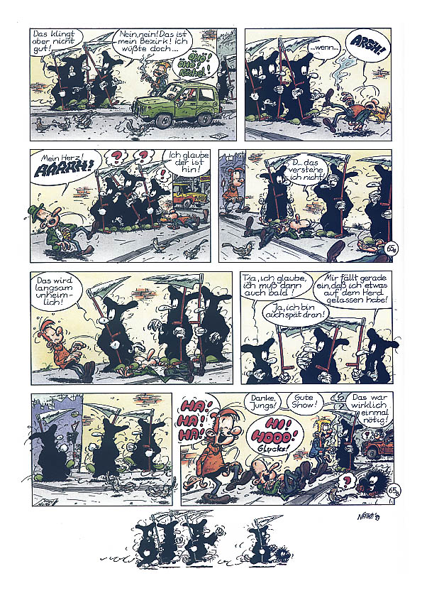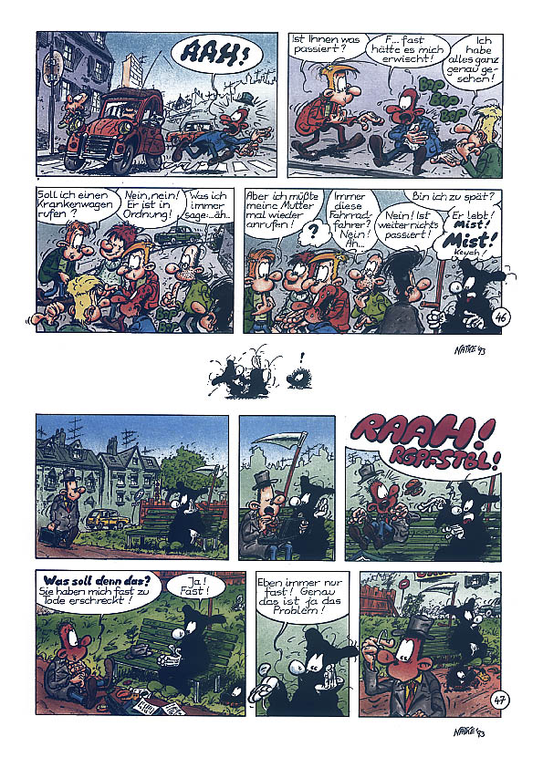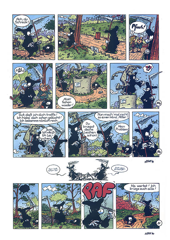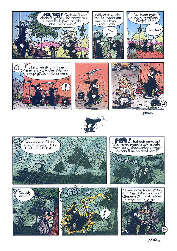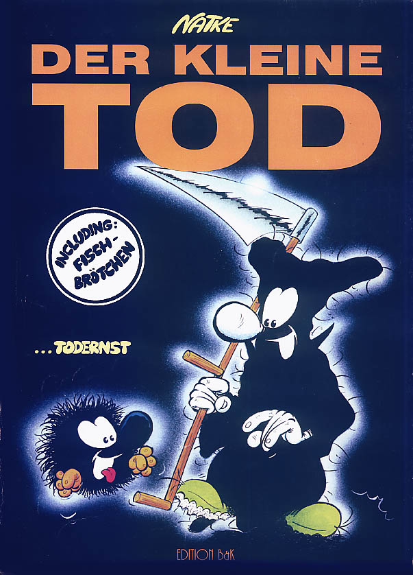 1990 kreierte Natke den Kleinen Tod. Wahrscheinlich in Anlehnung an seine Serie "Die Mönche", die in ganz ähnlichen Kutten ihr Unwesen trieben.Es ging dabei um einen Sensenmann, dem es partout nicht gelingen will, seine "Kunden" ins Jenseits zu befördern. Es entstanden zunächst nur 10 halbseitige Gags (acht davon sind auch im Album zu finden). Erst Ende 1992 nahm Natke die Idee wieder auf und zeichnete bis Anfang 1994 die Gags 11-106 in unterschiedlichen Formaten. Da Natke sich von seinem bisherigen Verleger getrennt hatte, dauerte es bis 1995, bis er mit der Edition B&K einen neuen Partner fand. So erschien der erste Band "... todernst" 1996. Er enthält die Gags 3-83,85 und 86. Die erste Seite mit den Gags 1 und 2 hat der Zeichner nie "rausgerückt", der Gag 84 diente als erste Seite für das zweite Album. Die Gag 82 und 83 wurden die neuen Eröffnungsseiten. Das Album endet mit einem kleinen Disput über die Konsequenzen, sollte der Kleine Tod sich dem Zeichner zuwenden (unten auf dieser Seite). Doch auch mit diesem Verlag hatte Natke kein Glück. Schon zwei, drei Jahre später gab es die Edition B&K nicht mehr. Als sich im Jahr 2000 der zuständige Vertrieb "Medienservice" in Wuppertal mit der Frage nach "Nachschub" an Natke wandte, kam es zu einer Neuauflage im Unser Verlag. Nur die Titelseite wurde dabei leicht verändert (unten auf dieser Seite) und auf der Seite 26 wurde eine kleine Zeichnung ergänzt, die übersehen worden war. |